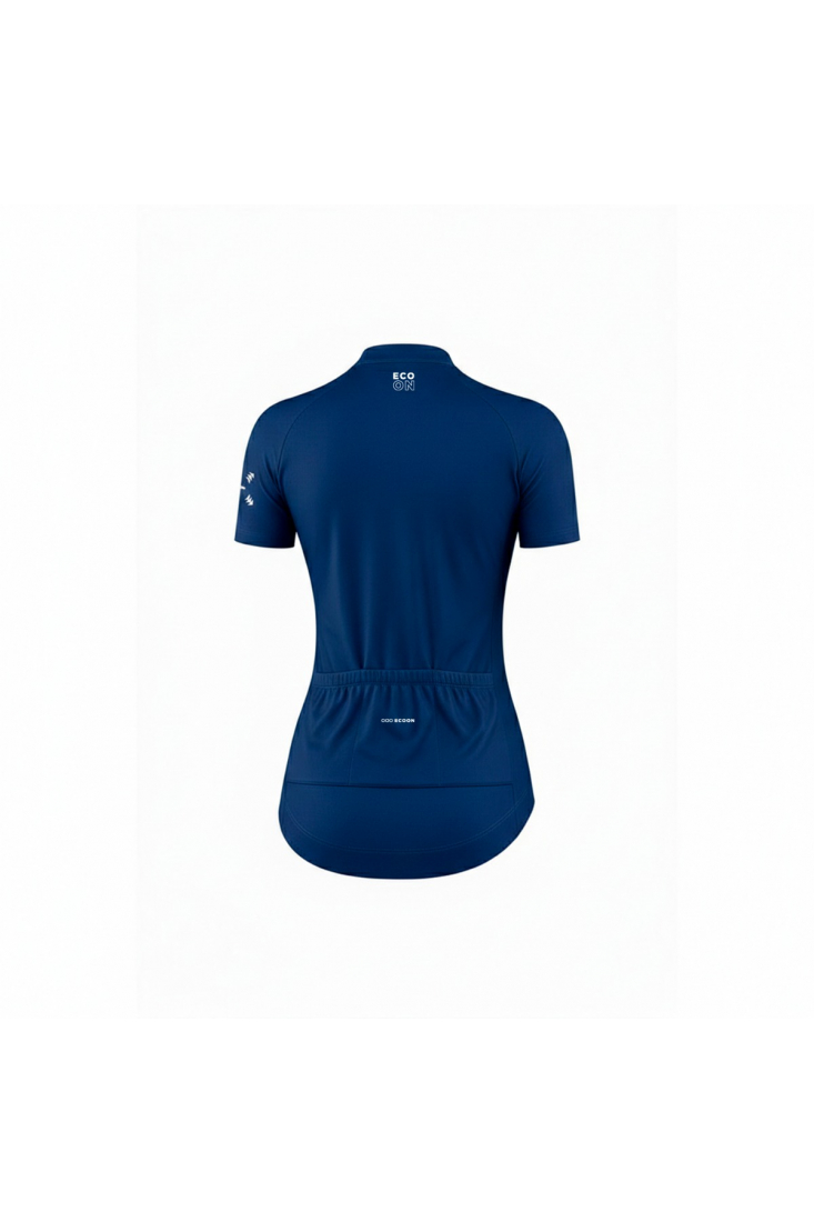 cycling T-shirt for woman short sleeve blue and white colour. Built to optimizes aerodynamics and muscle compression that stands out for its breathability ( 18.000 g/m2/24h y permeability 0,1 CFM) and next-to-skin.