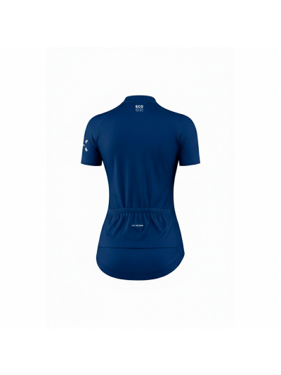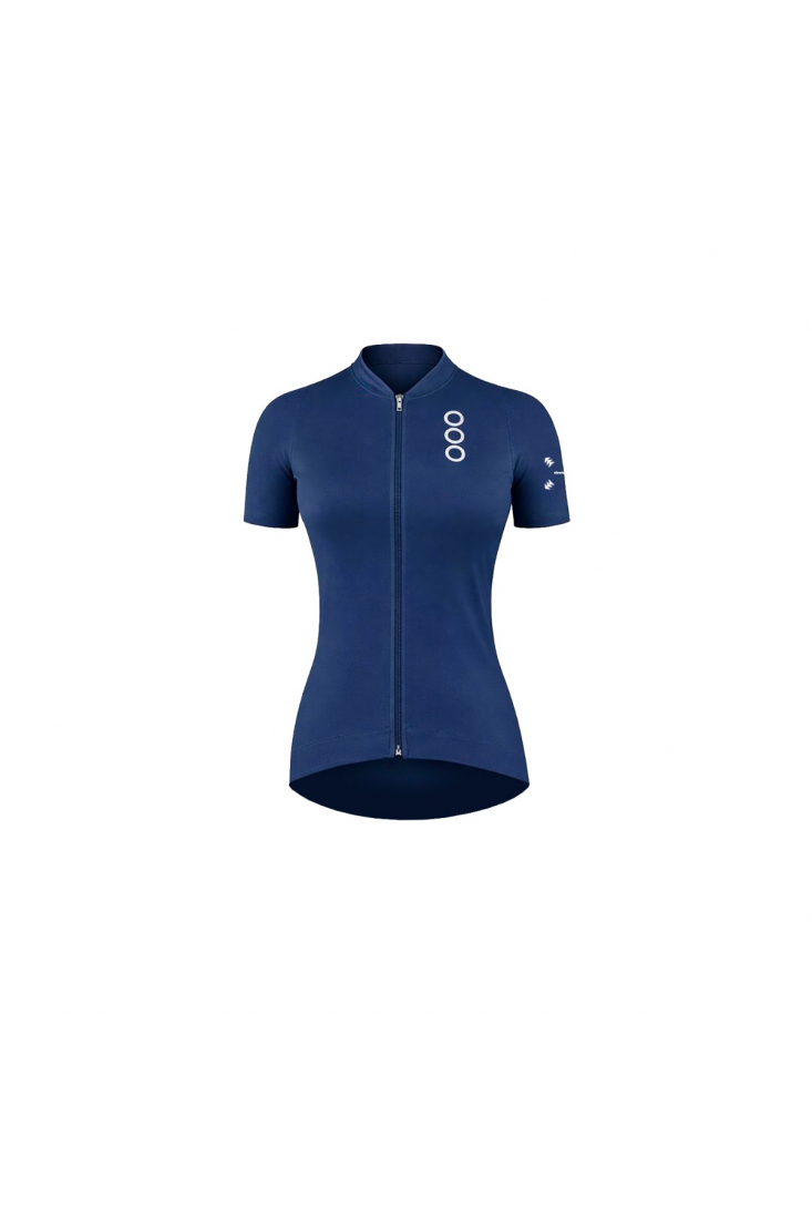 cycling T-shirt for woman short sleeve blue and white colour. Built to optimizes aerodynamics and muscle compression that stands out for its breathability ( 18.000 g/m2/24h y permeability 0,1 CFM) and next-to-skin.